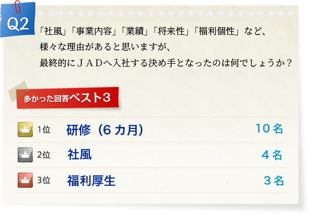 とことん「人」を大切にするというJADの理念やそこから生まれる社風・雰囲気などが決め手となったようです。