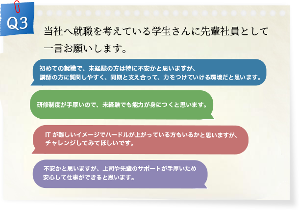 Q1でも新生活の不安を抱えている社員もいましたが、基礎からしっかりと教育しますので、安心して入社してください。